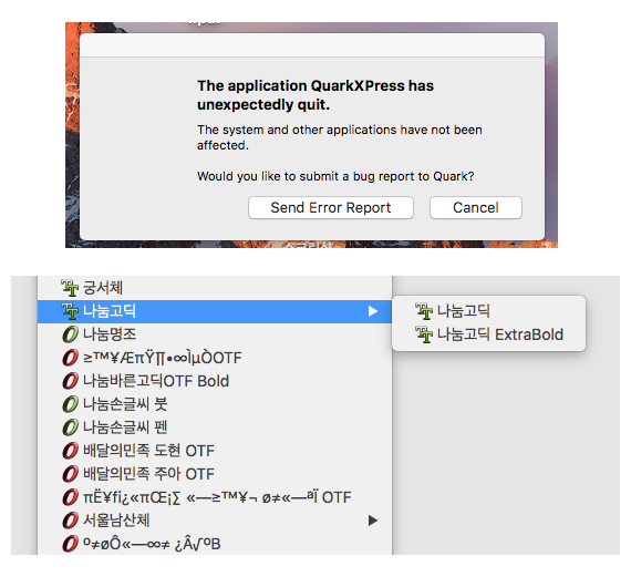 포토샵이나 일러스트에서는 제대로 나오는데, 쿽에서는 서체제목이 일부 깨져서 나오는게 있어요!!